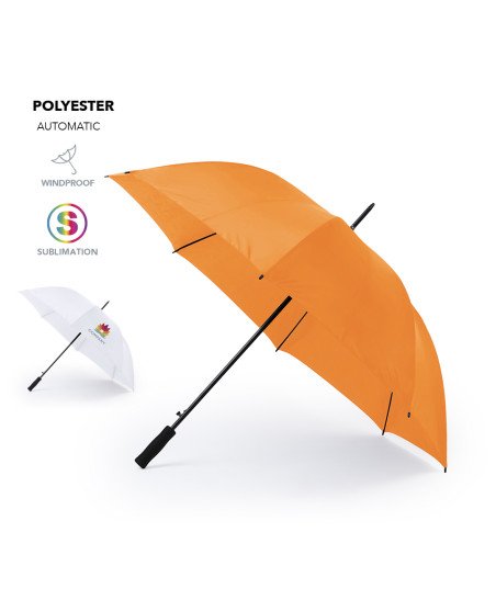 Paraguas de 8 paneles tamaño XL -130cm diámetro- con sistema antiviento. Apertura automática, en resistente poliéster y con varillas de fibra en color negro. Con mango acolchado de EVA y cierre de velcro. Disponible en extensa gama de colores.