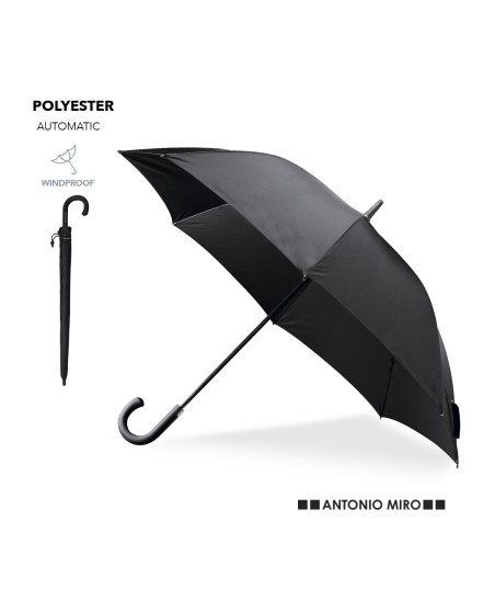 Paraguas de Antonio Miró de 8 paneles, con elegante diseño en color negro. De 120cm de diámetro, con apertura automática, sistema antiviento y en resistente material pongee. Con varillas metálicas en color negro, cierre de velcro y mango de suave tacto. Presentado en funda con logotipo de la marca y cinta con accesorio de ajuste.